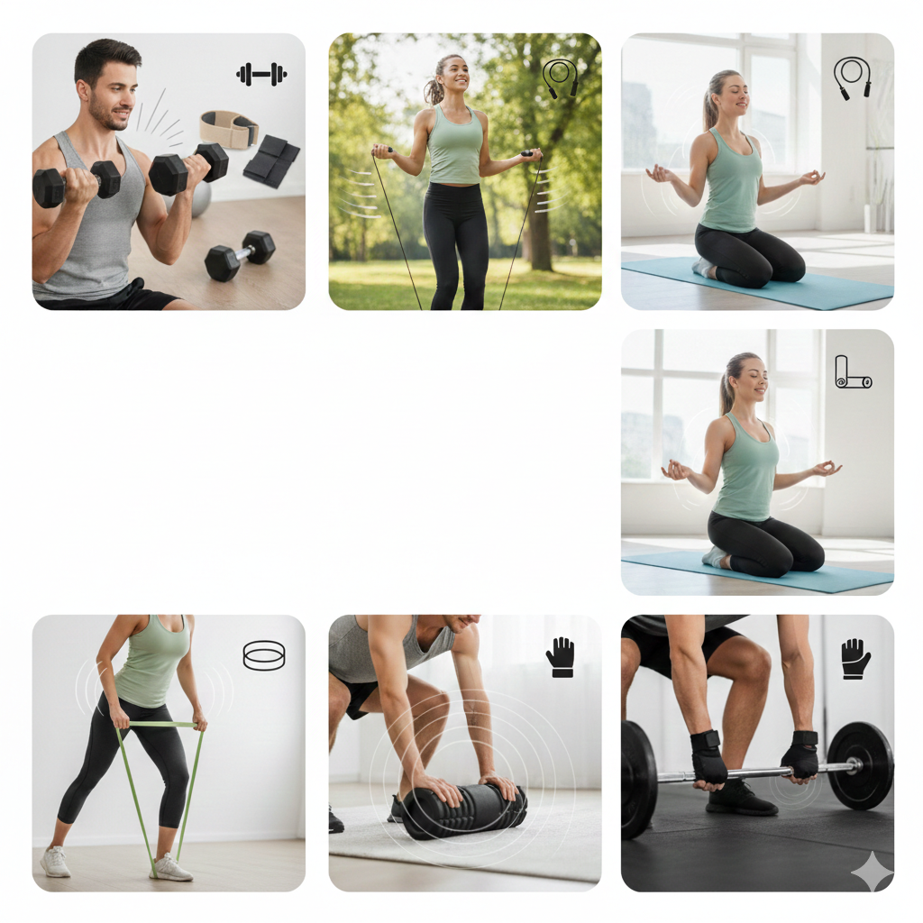 Apresentamos acessórios desenvolvidos para otimizar o desempenho, aumentar o conforto e melhorar a segurança durante os exercícios, como faixas elásticas, colchonetes, cordas de pular, halteres, caneleiras, rolos de liberação miofascial, luvas, straps e acessórios de apoio, ideais tanto para iniciantes quanto para praticantes avançados. Também destacamos os materiais e tecnologias mais comuns nesses produtos, como borracha natural, látex, EVA, neoprene, tecidos respiráveis e sistemas de ajuste ergonômico, explicando seus benefícios e aplicações.